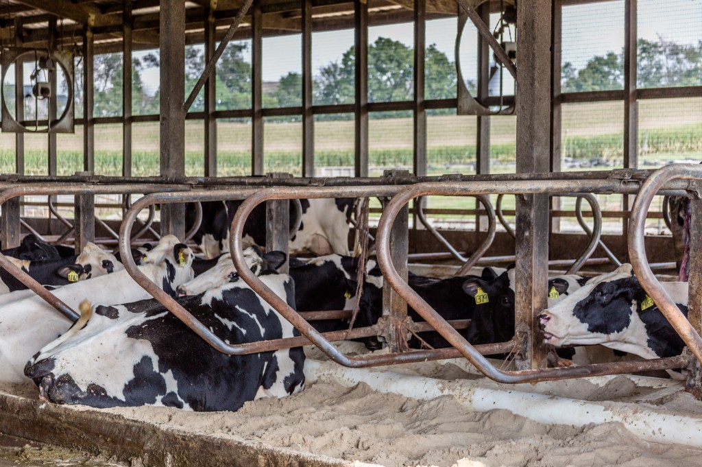 Stalls are deep bedded with sand, routinely groomed, and two loads of fresh sand are added every other week. Fans move the air over the cows in the barn, and intermittent sprinklers keep them cool when it’s hot. Alleys are scraped when cows are brought up to milk.