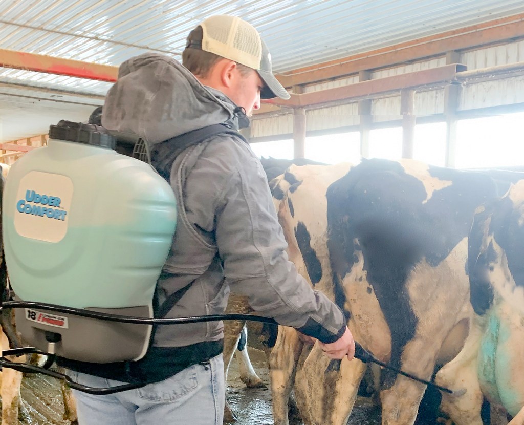 “We love the Udder Comfort Backpack Sprayer and highly recommend it. We use it every day to apply the product to two groups: post-calving and high conductivity. We find 2x/day for 3 days is optimal for fresh cows, 5 to 7 days for fresh heifers,” Chad reports. “We get a direct and accurate application, even though our cows are not restrained in the robot facility. This backpack exceeds our expectations, delivering effective results in our robot facility — without headlocks — that are comparable to when we used to apply it standing in the pit of a parlor with the cow secured.”