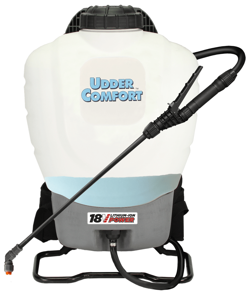 Then, in 2021, after closing the parlor with the fifth robot starting up, they upgraded to the Udder Comfort Battery-operated Backpack Sprayer.