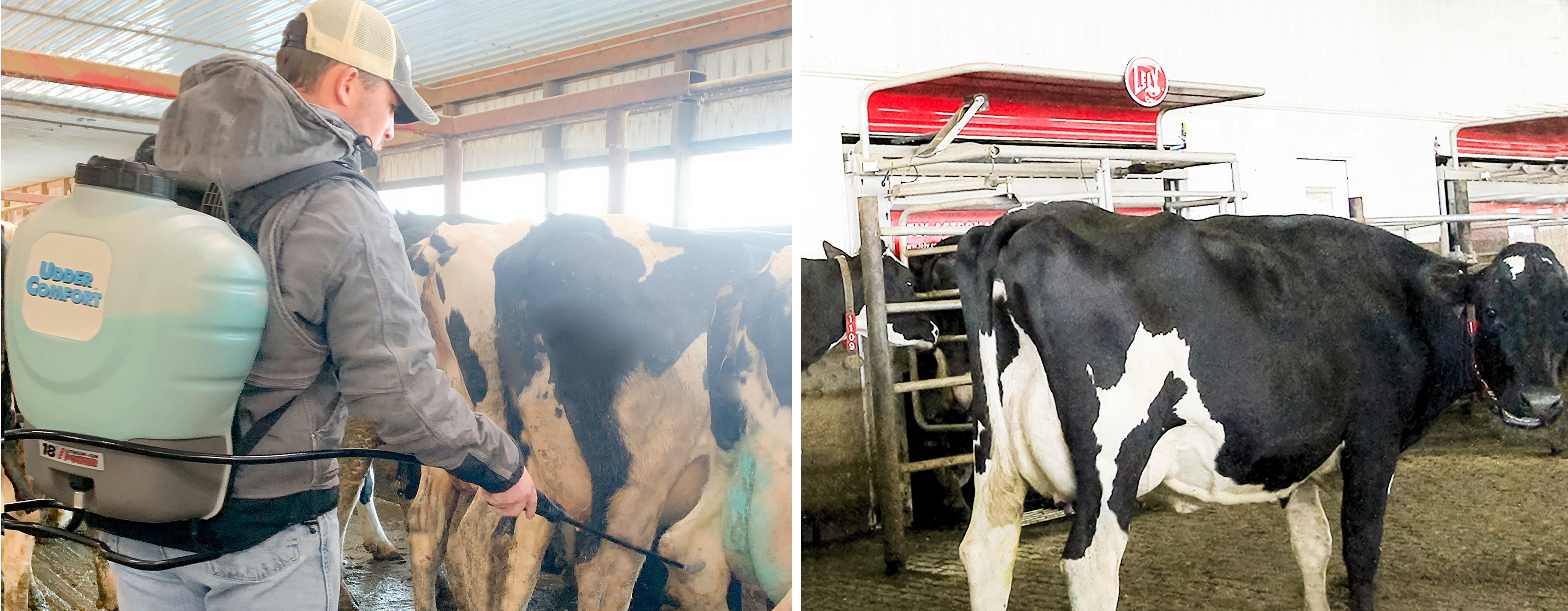“We love the Udder Comfort Backpack Sprayer and highly recommend it. We use it every day to apply the product to two groups: post-calving and high conductivity. We find 2x/day for 3 days is optimal for fresh cows, 5 to 7 days for fresh heifers,” Chad reports. “We get a direct and accurate application, even though our cows are not restrained in the robot facility. This backpack exceeds our expectations, delivering effective results in our robot facility — without headlocks — that are comparable to when we used to apply it standing in the pit of a parlor with the cow secured.”