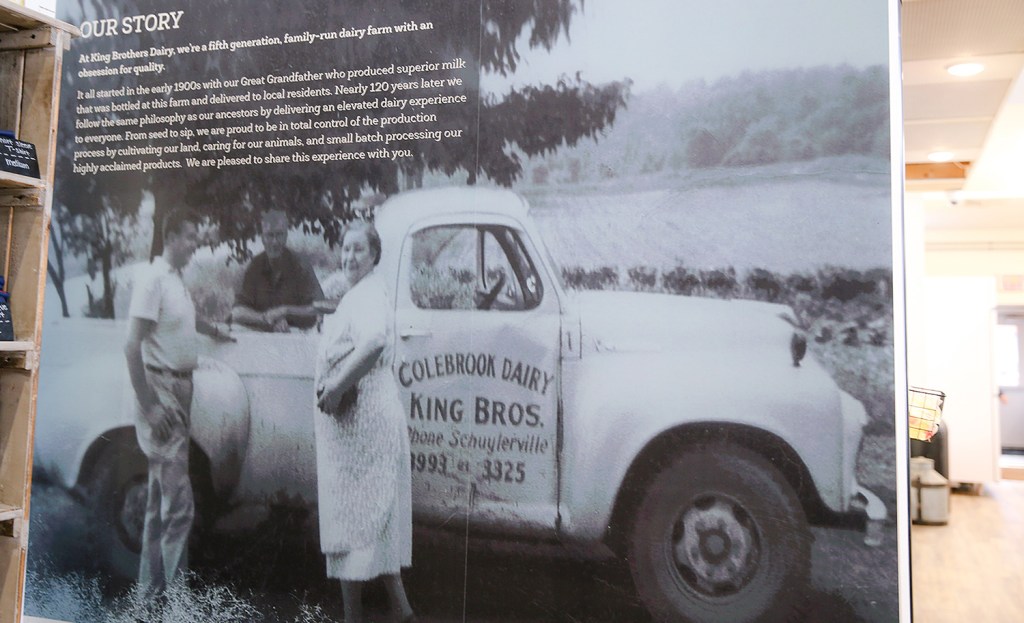 Along the back wall, a window looks into the stainless-steel labyrinth of processing equipment in the facility that backs up to the milking parlor. A perpendicular wall brings history into view with a muraled photo of William King and his siblings selling milk from the back of a pickup truck. That was the former King Brothers Colebrook Dairy, bottling and delivering milk from 1932 to the early 1960s from this Saratoga County, New York farm in the hamlet of Bacon Hill near Schuylerville.