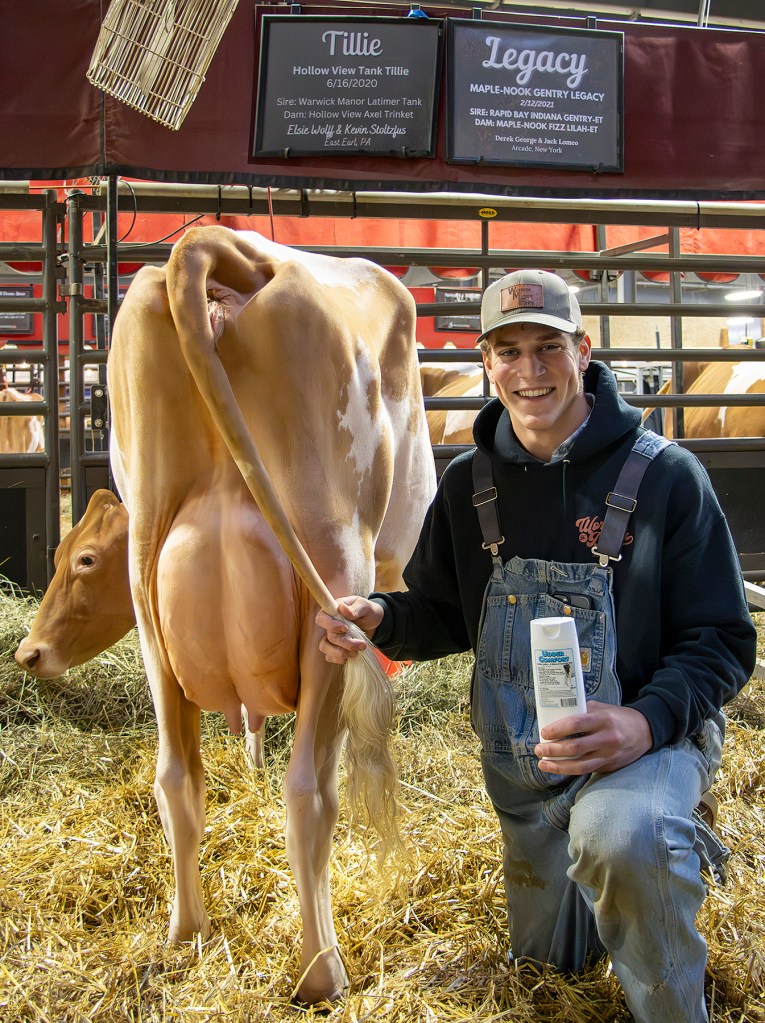 Kolby Stoltzfus (right) of East Earl garnered senior and grand champion of the International Junior Guernsey Show with his bred-and-owned Hollow View Tank Tillie. Kolby is a Garden Spot High School graduate working fulltime as herdsman on his family’s Warwick Manor dairy farm as his father Kevin makes ice cream and bottles Golden Guernsey milk from this high component herd in the creamery at Yoder’s Country Market, New Holland. Kolby loves tracing lineages back to old cows and seeing how they have developed and how far the Guernsey breed has come over the years under their two prefixes. Hollow View goes back to Elsie Wolf’s breeding in Quarryville, Pennsylvania. Tillie’s sire Warwick Manor Latimer Tank was also bred by the Stoltzfuses.