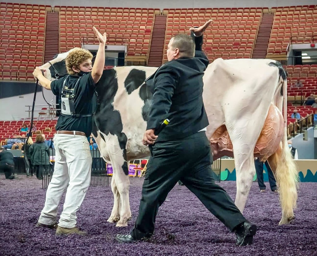Cali was grand champion of the International Holstein Junior Show at World Dairy Expo in 2021 (above), where she also won her class four years in a row in the junior competition, and was second-place aged cow in 2024 open competition.